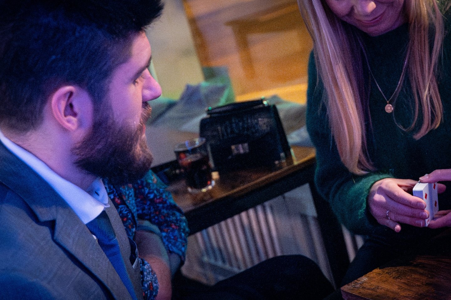 ”Vince nous a ravi. 30 personnes subjuguées par ses tours de cartes. Extraordinaire. Nous le recommandons les yeux fermés.”